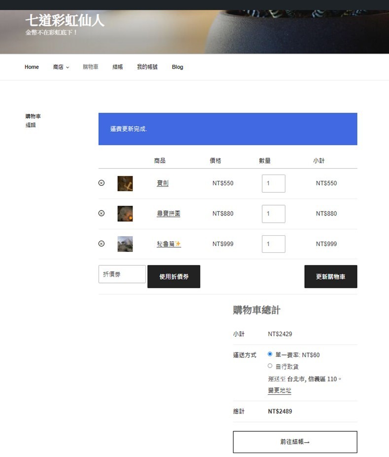 而我主要負責的項目是woocommerce的安裝、商品建置、新增商店和豐富網站內容等等,建立一個商務網站,真的不輕鬆,排版要合適、資訊要詳細、照片大小要調整、購買的方式及地區等等都要做好設定,幸好有組員們一起分工合作,最後產出一個這麼棒的商務網站,也謝謝之光老師這學期上了這麼實用的課程,讓我們又多了一項技能,這在未來職場上也能發揮到!