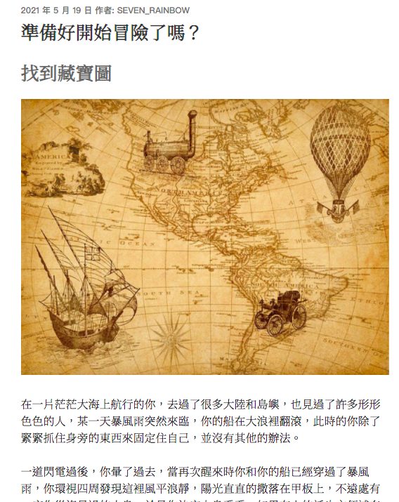 寫Blog的發想部分,則是透過前面同學設定的三個步驟當作小標題,然後開始擴寫篇章,隨著劇情的進展一步步帶出我們的遊戲內容,吸引大家來觀看,最後為他們勾勒出一個刺激精彩的冒險故事,同時這也是我們推出遊戲的劇情介紹。