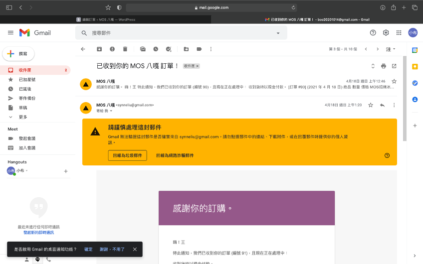 對於本次網頁上架商品的部分,是過去從未接觸過的區塊,看著原本空白的網頁到現在上架多項商品,最後再到真的能夠形成訂單,感覺很有成就感。儘管在製作的時候遇到不少困難,但在循錯、解決的過程中反而學到更多。整個網站雖然不是真的在營運,但一切功能就跟一般商業網站一模一樣,以後若有機會創業也會想架設一個這樣的網站,因為簡易上手,卻又是真的很實用。