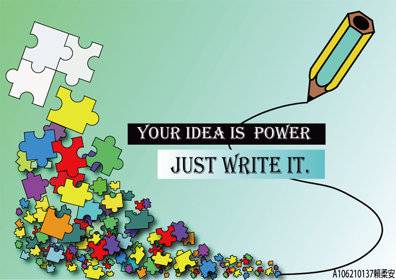從這個作業除了照著老師教學做了一隻鉛筆以外,也讓我感受到路徑管理員,關於物件重疊的時候所展現出來的魔力,因此有點玩上癮了,你們能從我做拼圖的那個部分看出來,我在嘗試各種樣式的排列組合。而這個作品我想表現的就是,關於每個創作的產生都是由每個小零件、靈感如同拼圖般藉由自身匯集,最後呈現出來的。