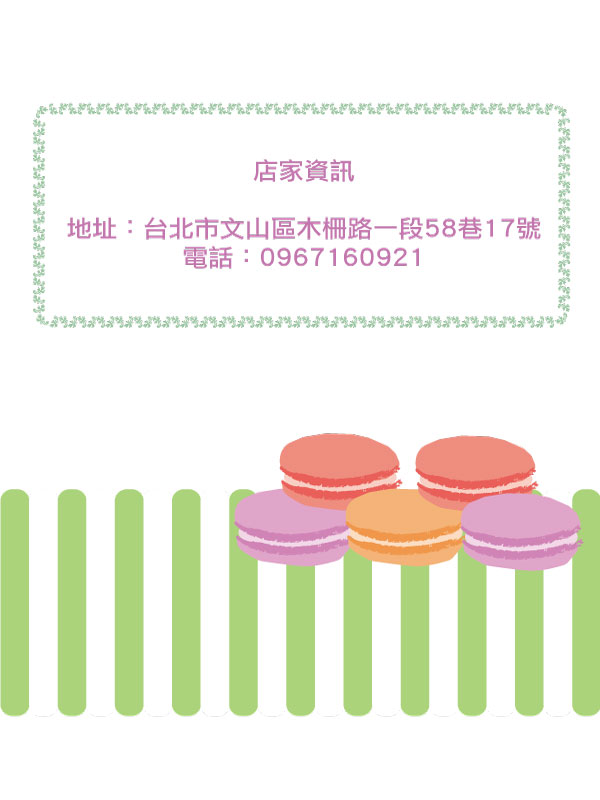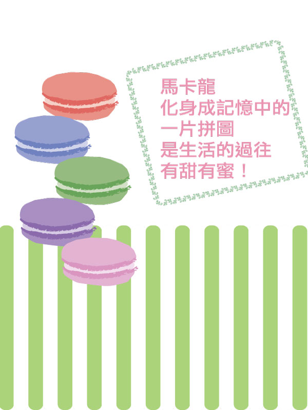 在做馬卡龍菜單的時候真的覺得相當的有趣,原本想做飲料的菜單,但後來看到老師做的馬卡龍太可愛了,因此也想自己試著做做看。重新做了好幾次,才終於做出了自己喜歡的形狀,雖然當我興奮的向朋友分享我做的可愛馬卡龍時,卻被嘲笑,但還是有鼓勵我比之前進步啦!而且在菜單名字上還有些小巧思喔!每一個都是我想了好久才想到的有趣菜單名稱。