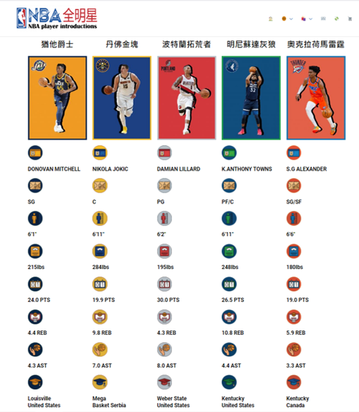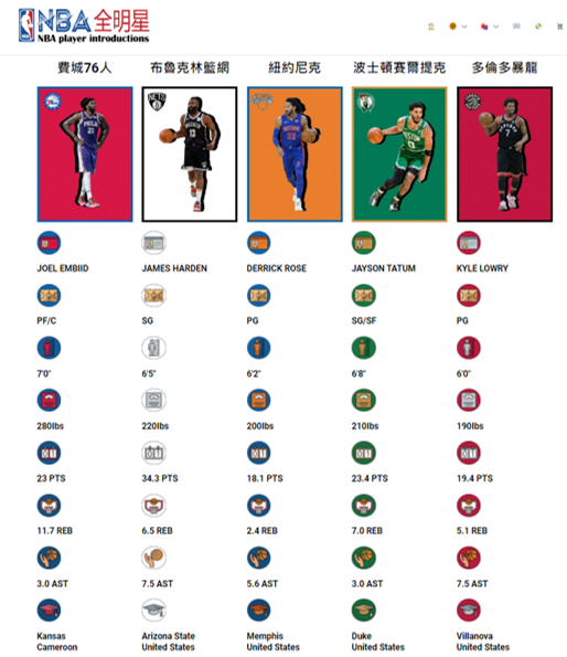 ,為球星介紹,包含名字、位置、身高、體重、得分、籃板、助攻、畢業學校,