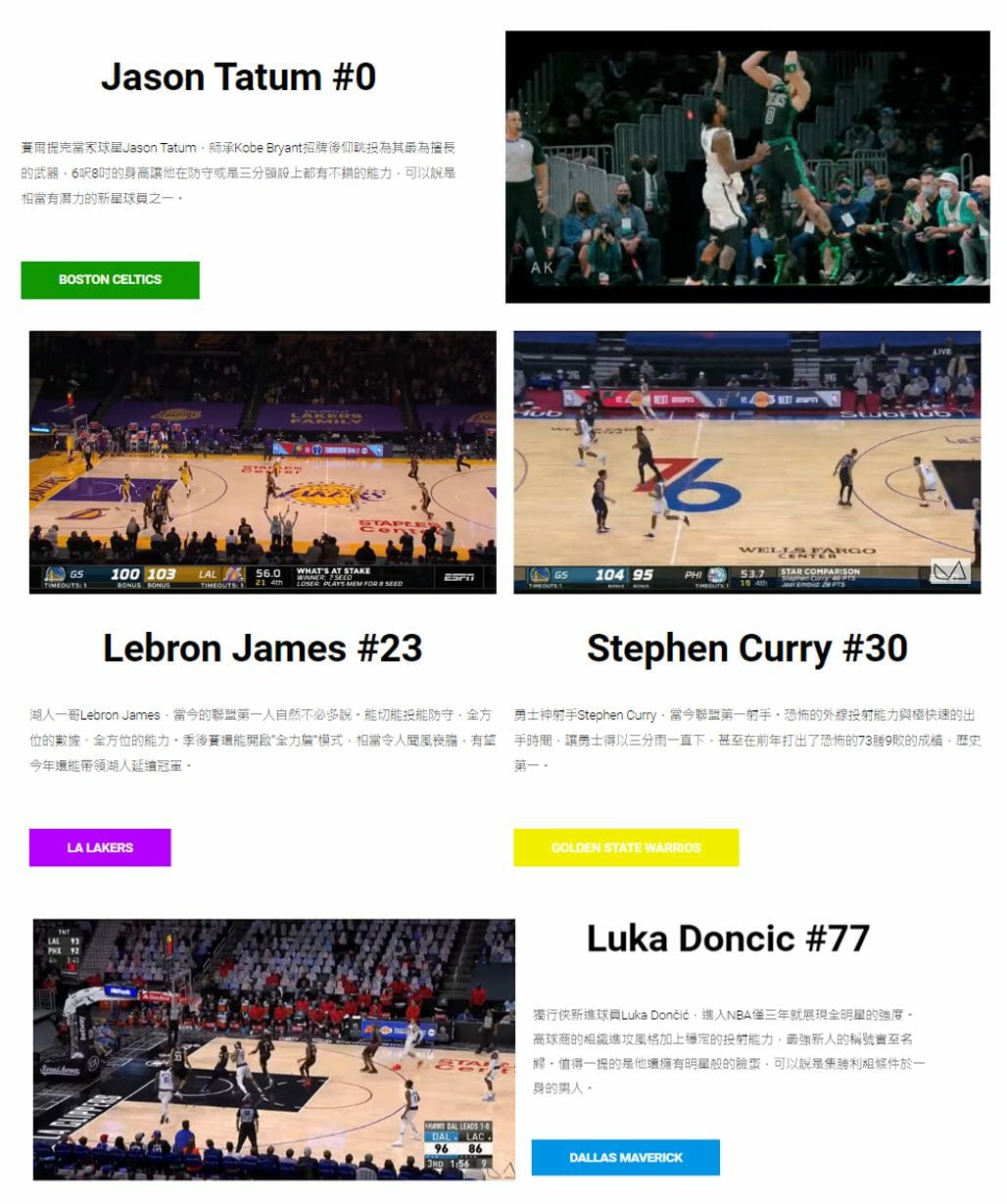 以上是「NBA全明星」網站的作品介紹~很感謝方之光老師用心準備教材,提供同學們學習。當團隊成員們遇到困境時,也會細心教導,並且額外再錄製教學影片,讓大家可以更輕鬆的完成網站架設。透過本學期的實作經驗,對於架設電子商務網站已不再陌生,希望在未來不管是AI、PS還是Wordpress都能夠學以致用。
