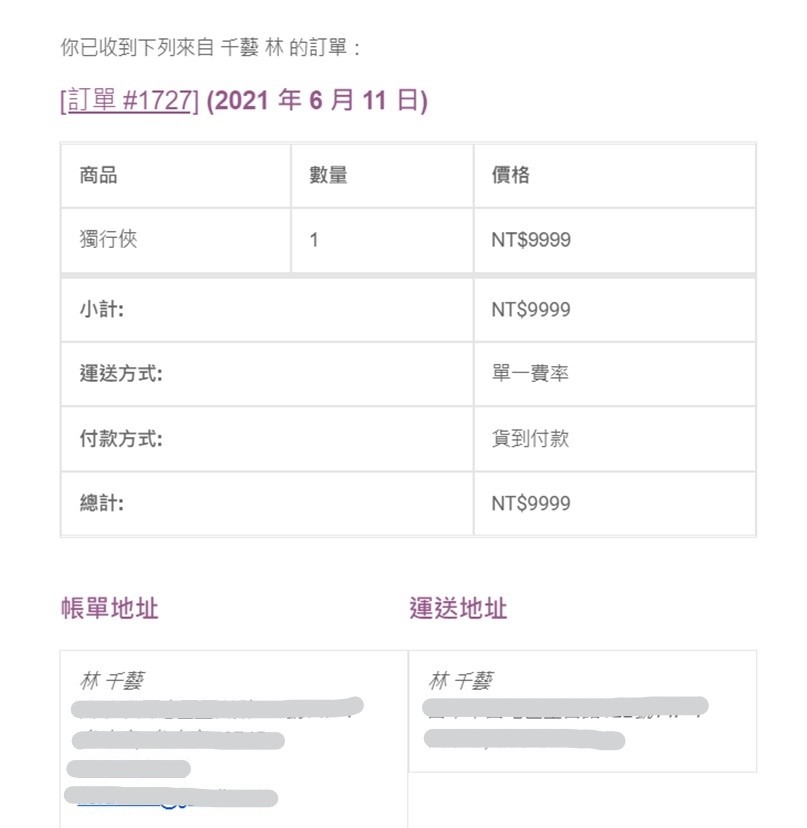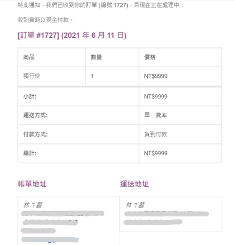 消費者接收到訂單成功通知頁面