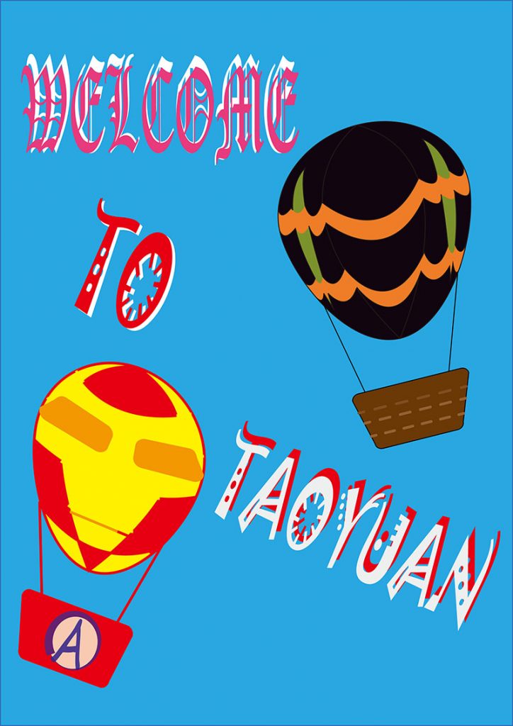這是我的熱氣球,因為家住桃園,之前剛好桃園有熱氣球提供大家搭乘,所以我就設計了一個海報,結合時下最流行的英雄系列(鋼鐵人主題),這次使用鋼筆工具很有心得喔!