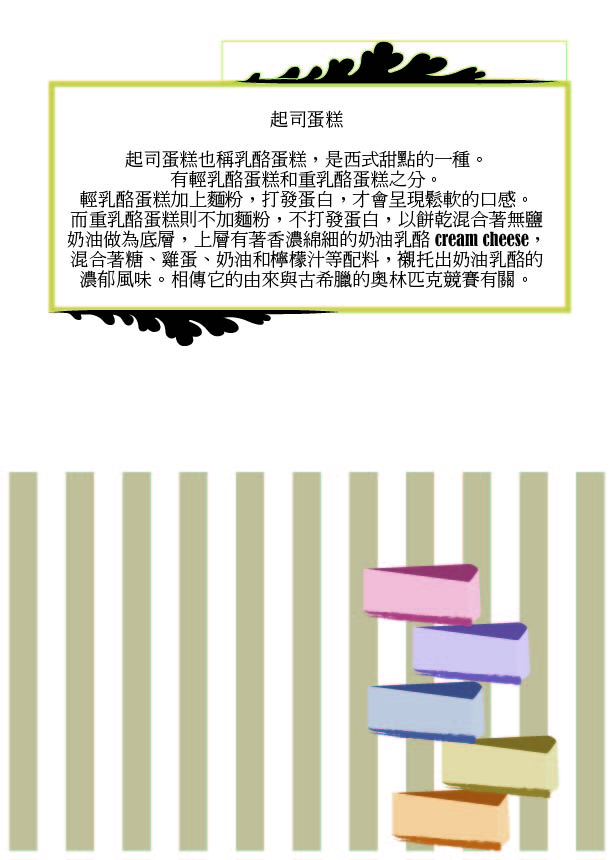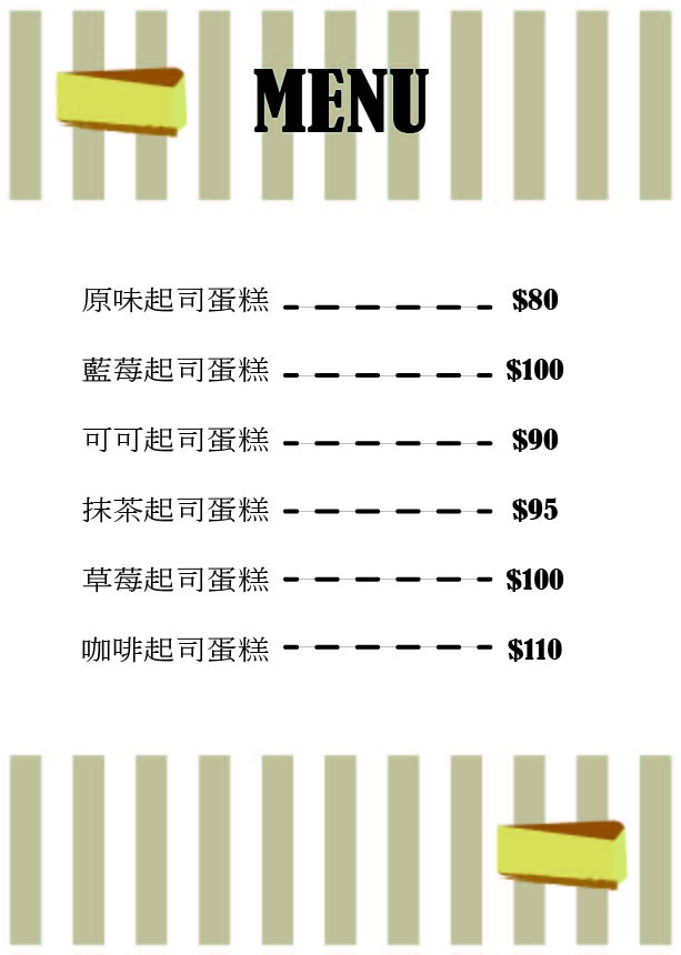 第三次作業,MENU設計,剛好在咖啡店打工,便以乳酪蛋糕做主題,自己手繪出乳酪蛋糕的樣品,雖然很簡陋,但第一次嘗試從頭到尾繪製,滿高興的,配合填塞和排列,與文字和各種邊框的設計,打造出一份菜單~