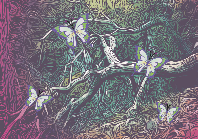 作業四介紹到對稱繪圖的繪製方式,這邊以蝴蝶來做例子,使用了扭曲與變形中的變形功能,其實這一個作業最主要的重點,是讓我們了解到運用對稱繪圖可以達到所謂事半功倍的效果,只要將蝴蝶的一邊繪製出來,另一邊自然也完成了。