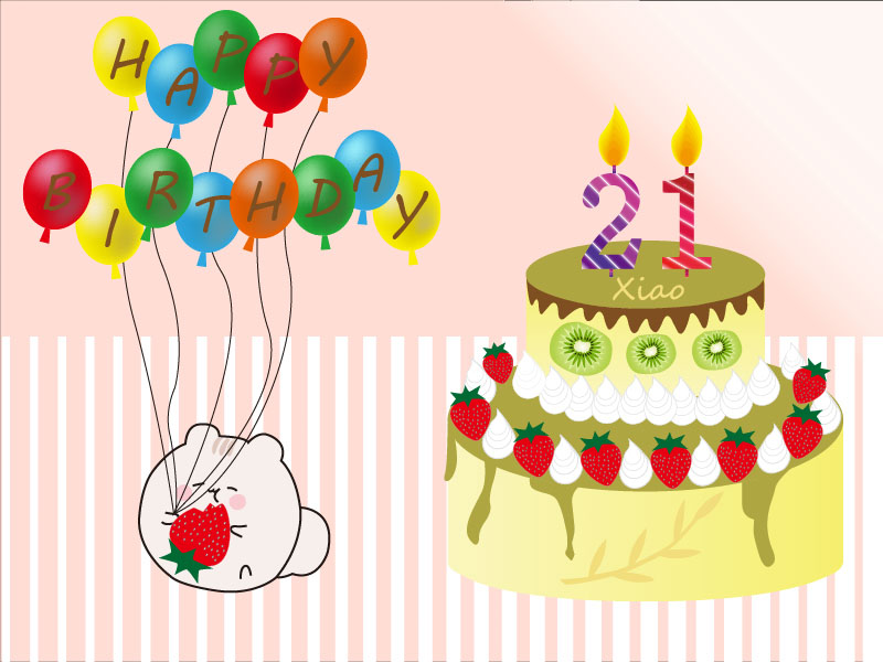 作業六也是頗具有紀念意義的一項作業,那就是生日卡片,在繪製這份作業時,時機點碰巧是別人的生日,因此靈機一動將這張卡片送給對方。卡片的內容主要是由蛋糕和氣球組成,在繪製蛋糕的過程中,讓我對鋼筆工具有了更多的洞悉,例如要繪製果醬流下來的模樣,就用鋼筆工具去勾勒出來。鮮奶油的部分先用錨點工具將圓形拉至形變,再用縮放工具重複兩、三次的複製,就能繪製出鮮奶油的外觀,讓我大為驚嘆。還有蠟燭的部分,運用了更深入的漸層手法,使白色線條相間其中。氣球則運用了網格工具,將迎光面與背光面的效果呈現出來,讓氣球不再那麼單調。最後我在蛋糕最上層寫上了對方的名字,繪製了一隻對方常用的貼圖,將自己所學的成果,在重要的日子送給重要的人,這樣的付出使人感到滿足。